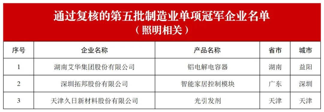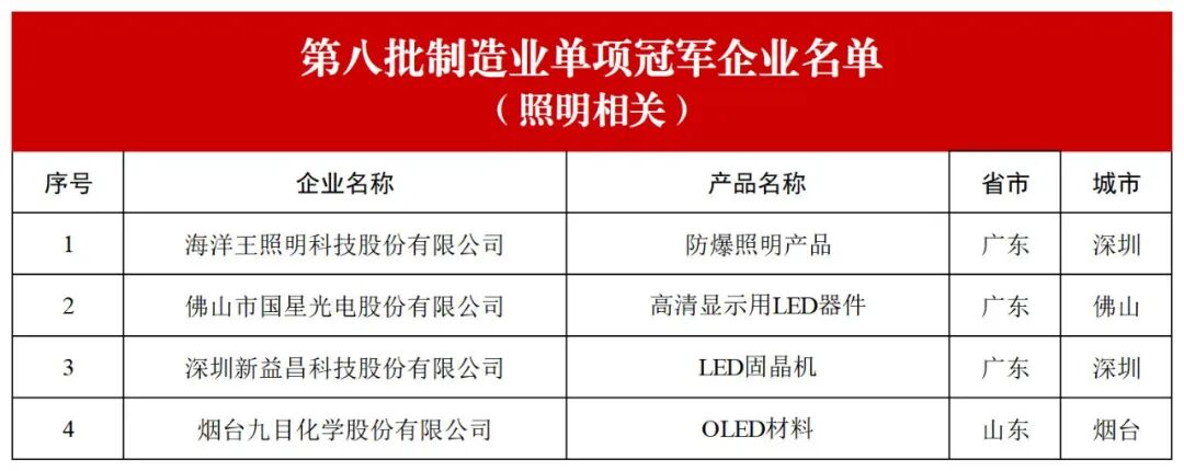 近期,工业和信息化部发布了386家第八批制造业单项冠军企业,以及通过复核的270家第二批、第五批制造业单项冠军企业名单。其中,中国照明电器协会理事单位海洋王照明科技股份有限公司和会员单位佛山市国星光电股份有限公司,以及深圳新益昌科技股份有限公司、烟台九目化学股份有限公司等3家照明相关企业及产品入选第八批制造业单项冠军名单;中国照明电器协会理事单位湖南艾华集团股份有限公司,以及深圳拓邦股份有限公司、天津久日新材料股份有限公司等4家照明相关企业及产品通过第五批制造业单项冠军企业复核。据了解,制造业单项冠军企业是指长期专注于制造业某些细分产品市场,生产技术或工艺国际领先,单项产品市场占有率位居全球或国内前列的企业,代表细分领域最高发展水平、最强市场实力,是我国制造业的一项顶级荣誉。截止目前,共有17照明行业相关企业被评为“国家级制造业单项冠军企业”。这些企业增强了我国照明行业的综合竞争力,为我国照明行业高质量发展提供了有益助力。