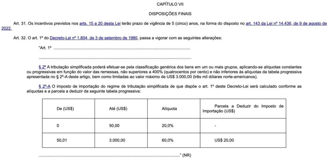 巴西联邦政府税改新规于2024年8月1日正式生效。新规要求对价值50美元及以下的进口商品按件征收20%的关税。该法案主要针对巴当地用户在希音、虾皮和速卖通等亚洲跨境电商平台上购买的低价商品。此前,巴西针对价值低于50美元的跨境电商进口商品包裹实行免税政策。此外,新政规定,对于价值在50至3000美元之间的进口商品包裹,将征收60%的进口税,但可在总体进口税金中每个包裹减免20美元;对于已加入合规缴税方案(PRC方案)的电商平台,将获得提前预申报及快速清关的便利。巴西联邦税务有关人士解读新政时表示,该措施旨在打击逃税行为,并规范许多公司使用分批采购方式来避税的情况。